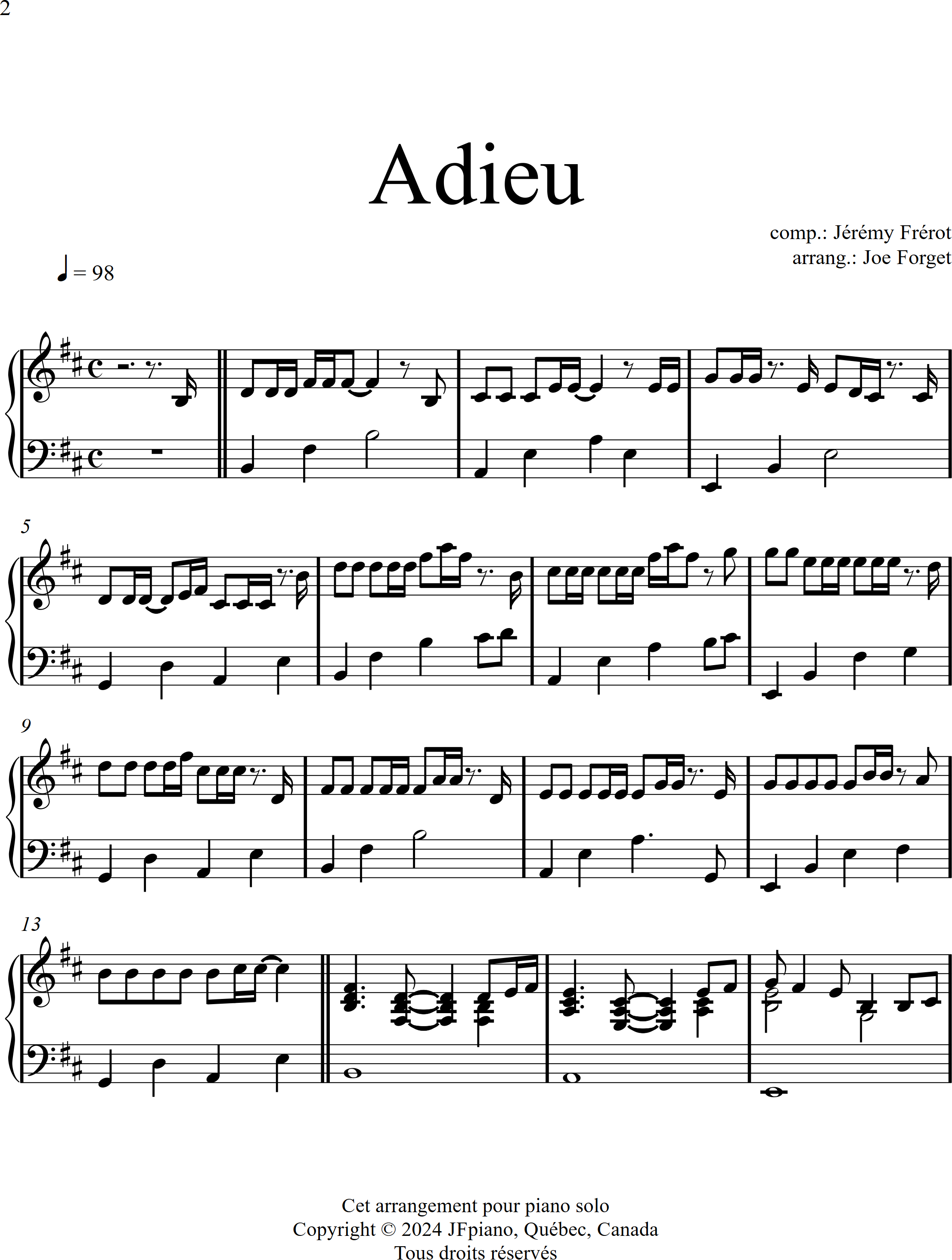 'Adieu' (Jérémy Frérot) partition piano, Niveau INTERMÉDIAIRE