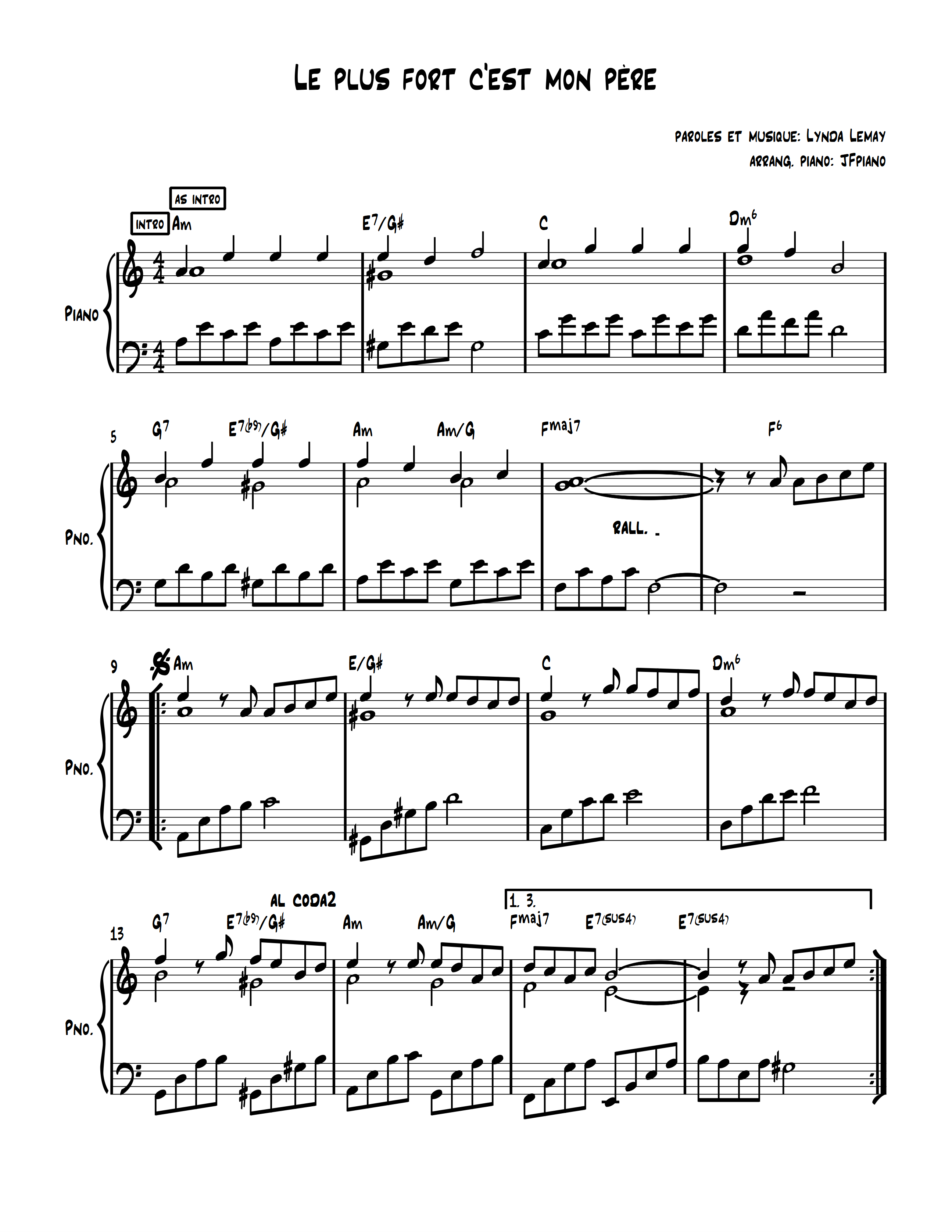 Cette adaptation pour piano de la chanson ''Le plus fort c'est mon père'' de l'auteur/compositeur/interprète Lynda Lemay a été conçue pour un élève de niveau intermédiaire. Plusieurs techniques pour main gauche y sont vues, telles les arpèges, Basse d'Alberti, le ''stride'', etc..