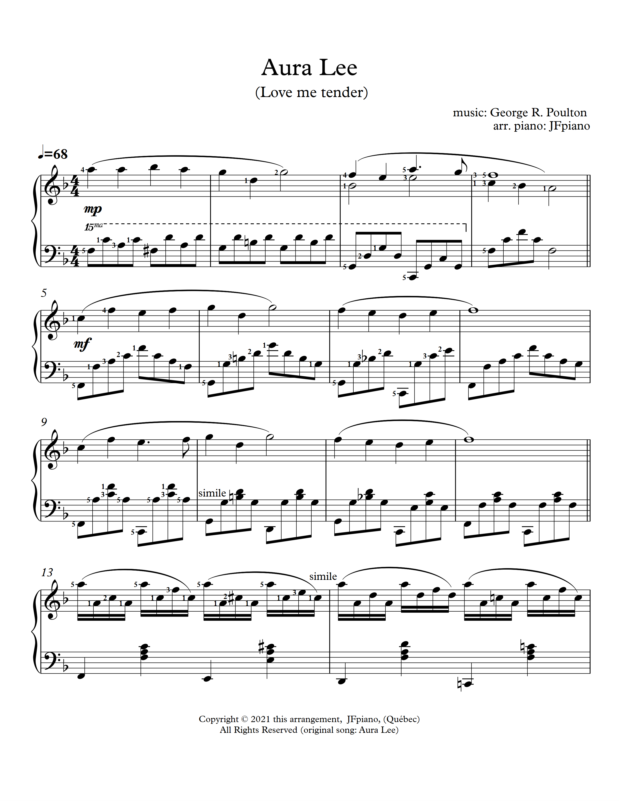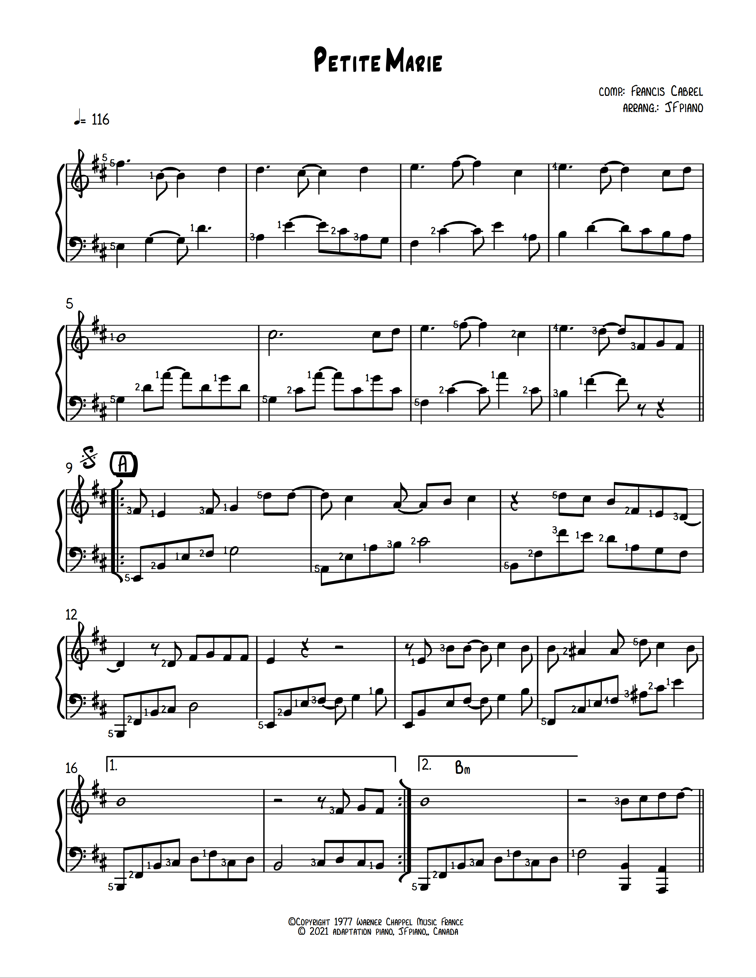 une adaptation pour l'étude du motif d'accompagnement de style valse à la main gauche. La mélodie est écrite sans ''syncopes'' pour faciliter la lecture, mais vous pouvez varier son rythme telle que la mélodie originale. Niveau Débutant-intermédiaire.