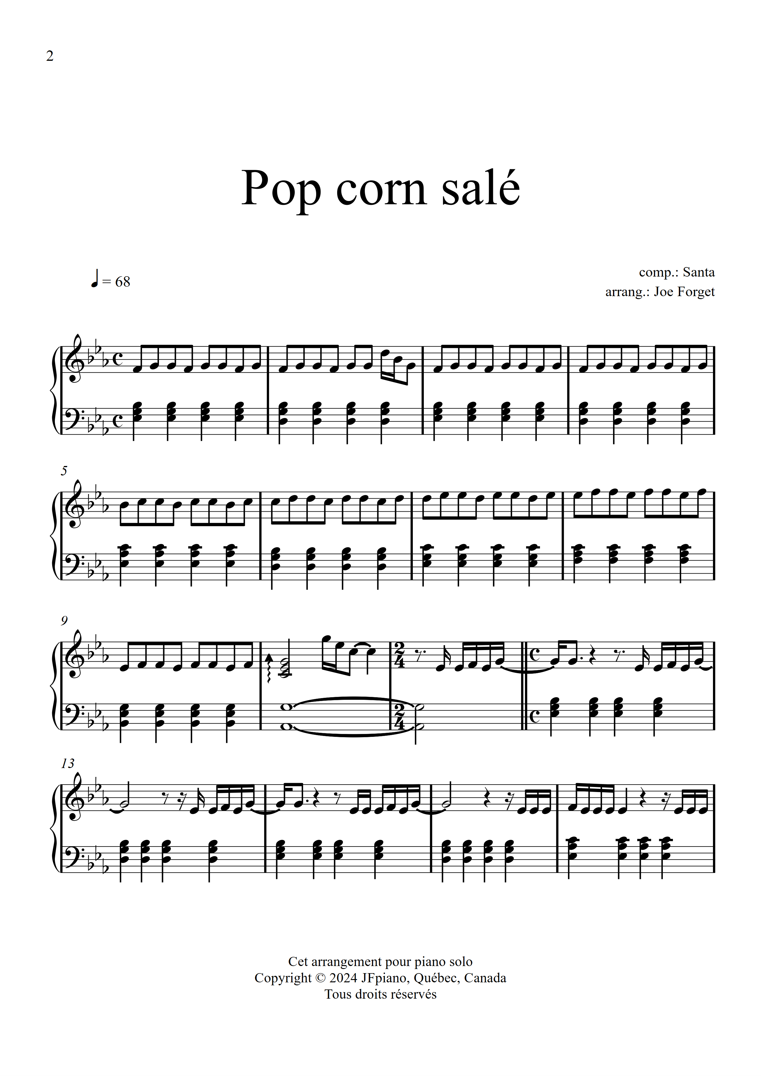 ''Pop corn salé'' (Santa) partition piano solo, Niveau intermédiaire 'simple'
